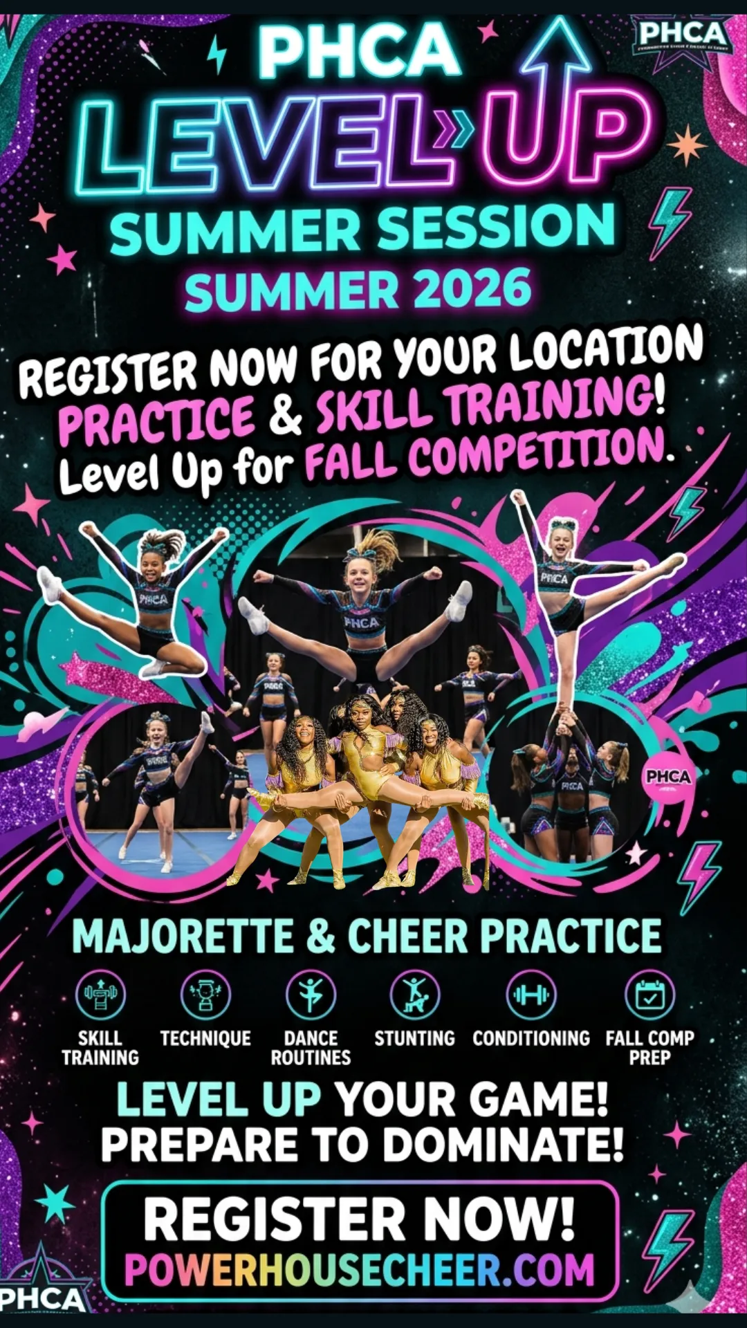 Powerhouse Cheer Academy welcomes athletes ages 5 and up! Our cheer program is divided into age-appropriate teams: Varsity (ages 5-12), All-Star (ages 10-18), and Pro (ages 15-18).